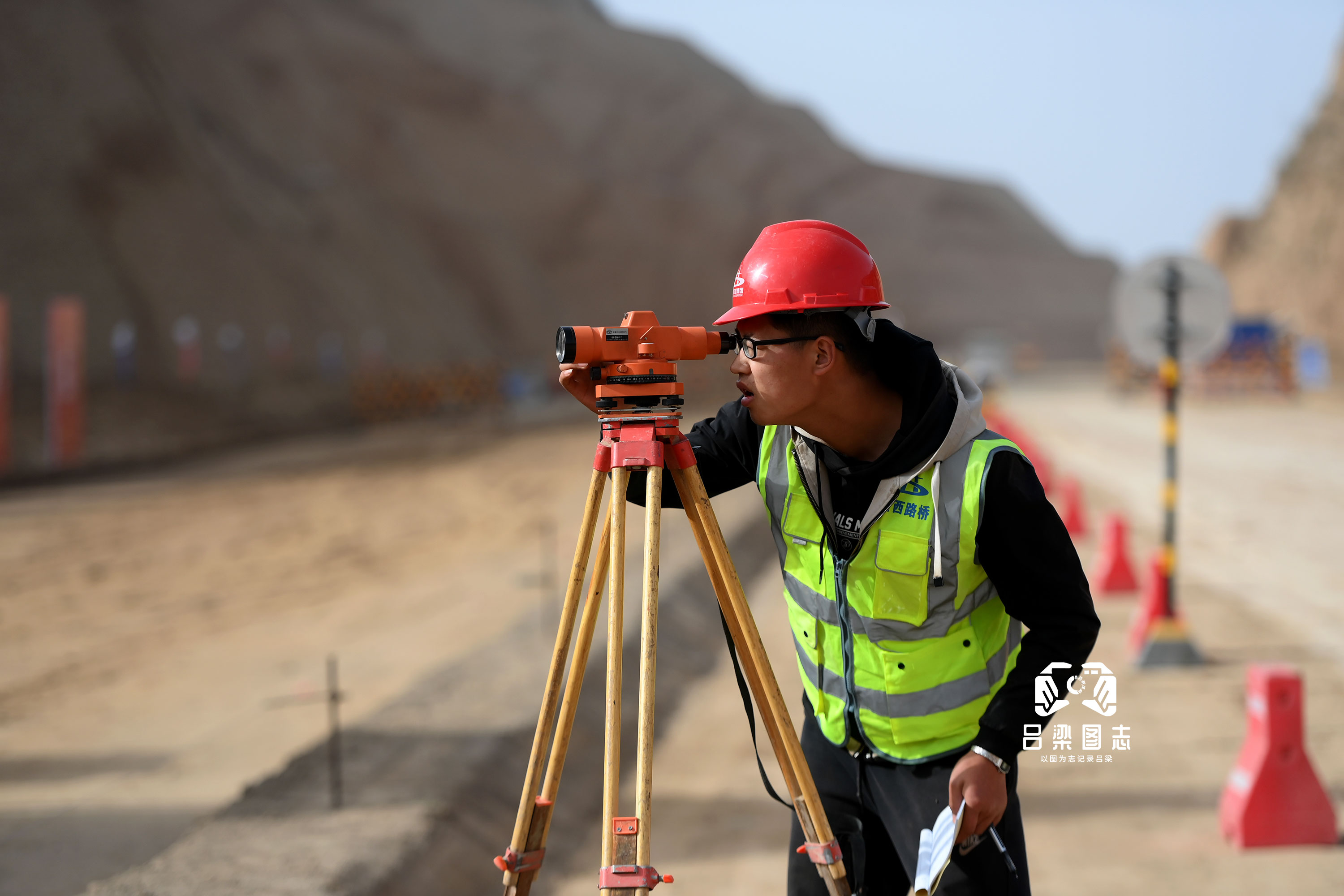 技术人员正在国道209线吕梁新城区公路改线项目CFB炉渣土路床铺筑施工现场进行测量作业