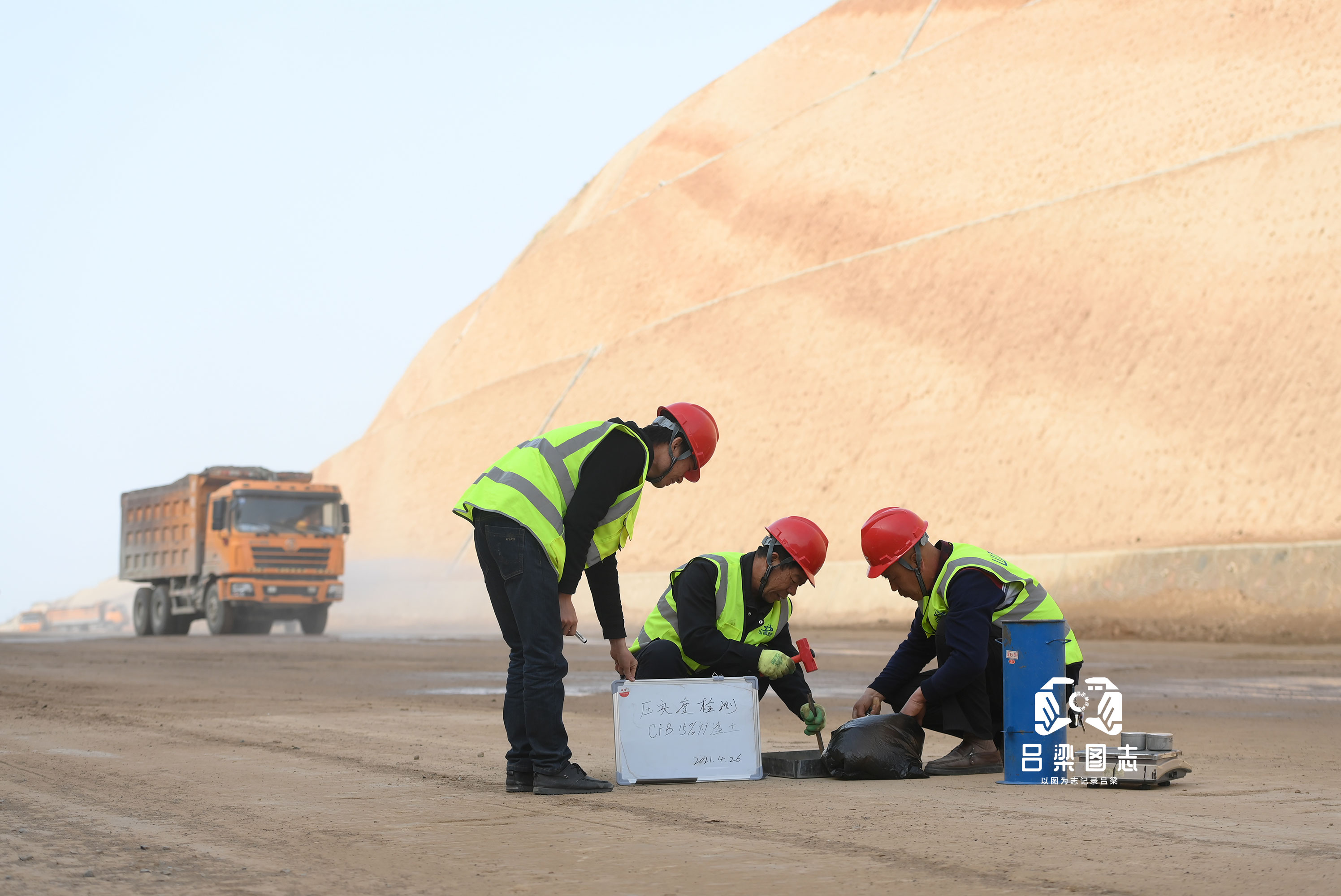 工人正在国道209线吕梁新城区公路改线项目CFB炉渣土路床铺筑段进行压实度检测。