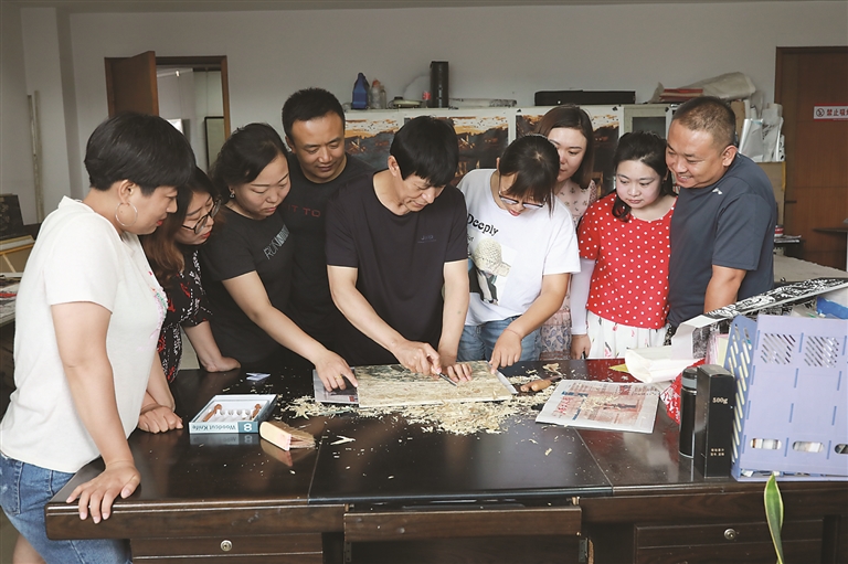 看着木屑落去,作品慢慢成形。他喜欢版画做出来时,那种含有木纹肌理的效果,一层一层,层次分明。每一个版画作品完整的展现在世人面前,都要历经从构思到起稿,再到设色,然后做版、刻板,最后翻印这一系列的流程。