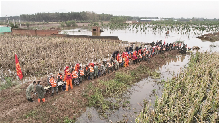 “水灾面前村里人都团结一致,村‘两委’干部包括下乡干部、片长,基本24小时都在这里守着,村里派上装载机,挨家挨户把人都接出来,组织年轻人帮助老人往出搬,巡逻护堤。”连夜将村民安全撤离后,五楼庄村村委主任武小艳组织人员用大型水泵抽排积水。