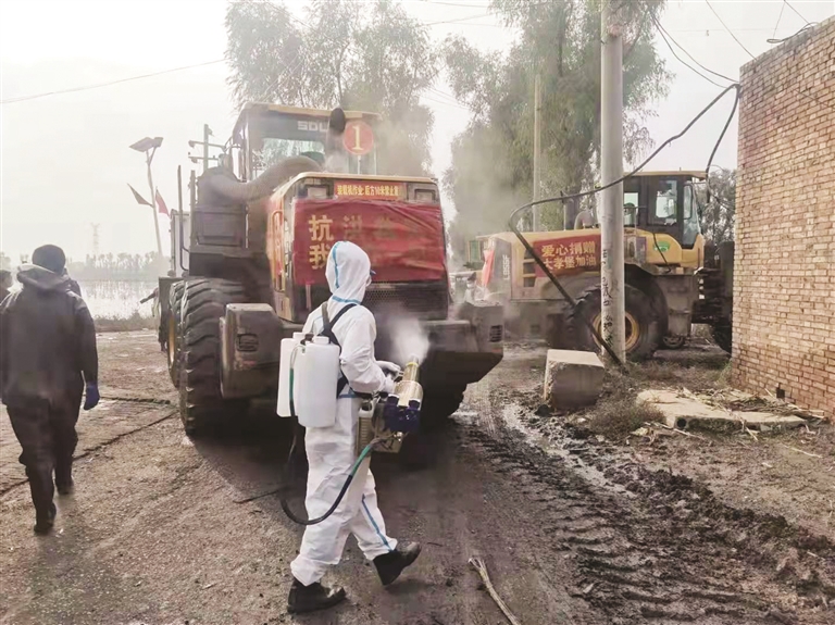 孝义市机关干部在受灾村清理村庄淤泥……排涝、清淤、消杀、防疫,各项工作都在有序开展。