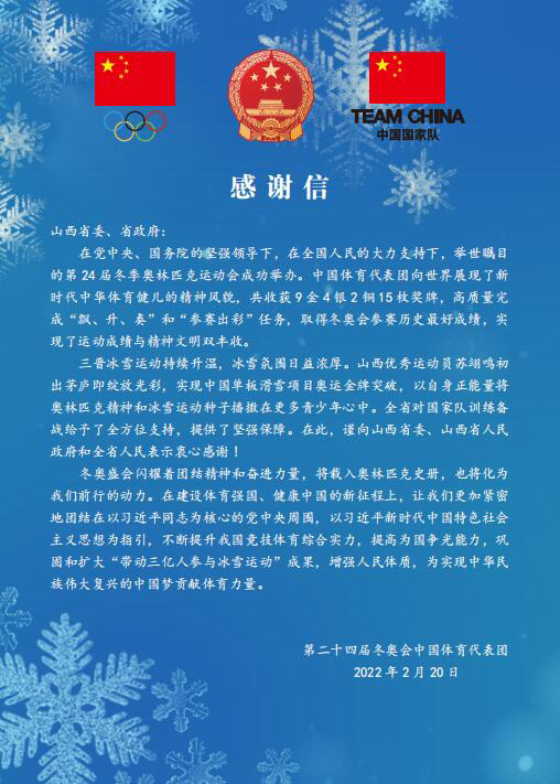 第二十四届冬奥会中国体育代表团向山西省委、省政府发来感谢信
