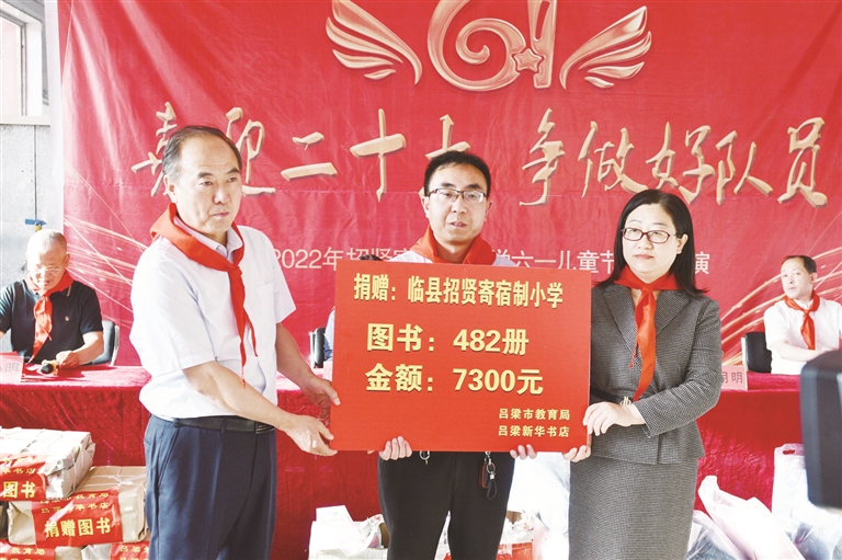 在吕梁日报社驻招贤工作队积极协调下,吕梁新华书店为临县招贤寄宿制小学的孩子们捐赠价值7300元的图书482册,市八一街幼儿园为孩子们捐赠4800元的学习用品。该校学生白锦萱说,今天有这么多伯伯阿姨来看望他们,和他们一起过“六一”,是她一年里最幸福、最高兴的一天。