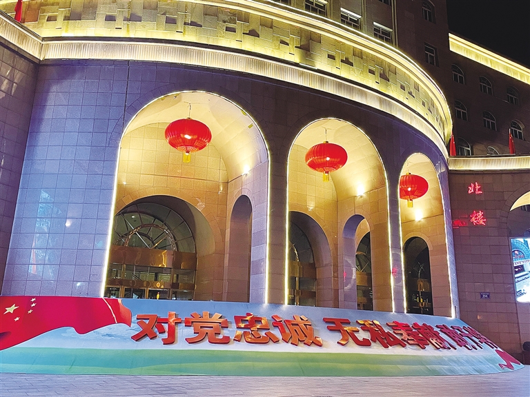 在吕梁城区,一大幅寓意祝福祖国的巨型彩绘画在吕梁宾馆大门亮相,吸引着市民的目光。作为国庆节期间向祖国献礼,画幅长35米宽4米,画面以彩色喷绘出蓝天、白云、绿草地为底色,画面上印刻的“对党忠诚 无私奉献 敢于斗争”12个红色立体字,在飘扬的红旗照耀下熠熠生辉。