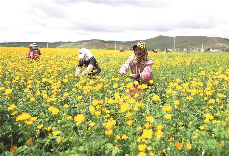 7月14日,河北省沽源县长梁乡兴隆堡村金莲花种植合作社的社员在田间采摘金莲花。