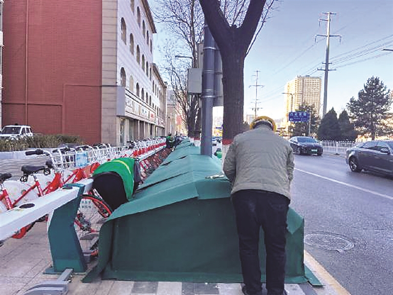 近日,离石区滨河路主干道路两侧的树木绿篱悄然发生了变化,市园林中心的园林工人为市区街道和公园广场等地的绿植穿上“防寒服”,搭起“小房子”,帮助绿化树木安全越冬。 记者 李亚芝 摄