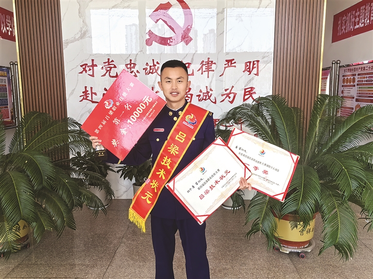 从一名列兵到二级消防士,他获得个人嘉奖7次,个人三等功一次,集体三等功一次。2019年、2020年他分别获得山西消防救援总队比武竞赛负重5000米个人第五名,吕梁市消防救援支队冬训比武竞赛个人综合第一名、5000米负重第一名。今年在第四届吕梁职业技能大赛上,他又获得消防个人项目类技术状元。