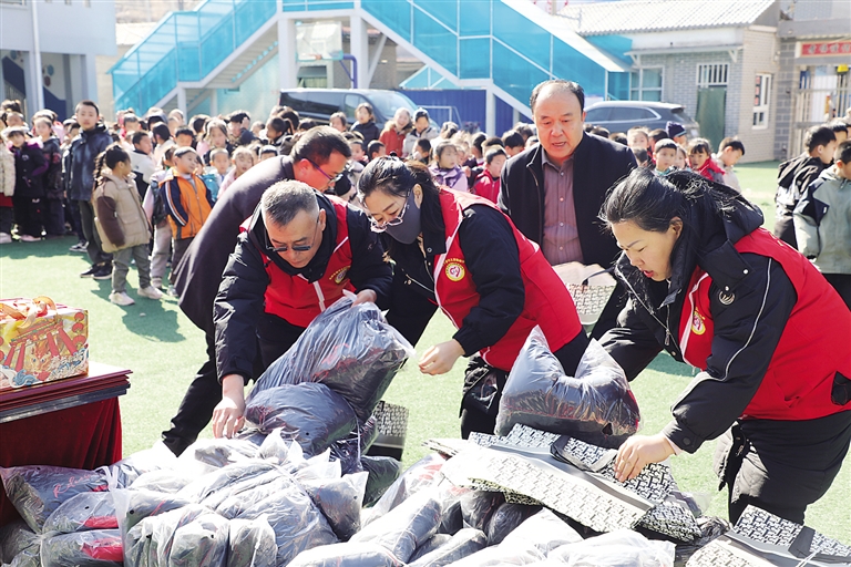 春日暖阳,微风习习。活动在庄严的升旗仪式中拉开序幕,在冉冉升起的五星红旗下,同学们排着整齐的列队以最饱满的姿态迎接此次捐赠。在捐赠仪式上,吕梁日报社、吕梁市农村信用合作社联合社、吕梁市留守儿童救助协会相关人员为219名留守儿童、单亲及困境儿童送上了羽绒服、棉手套、保暖帽子等暖心大礼包。城庄九年制学校为捐赠单位颁发了证书和捐赠牌匾。