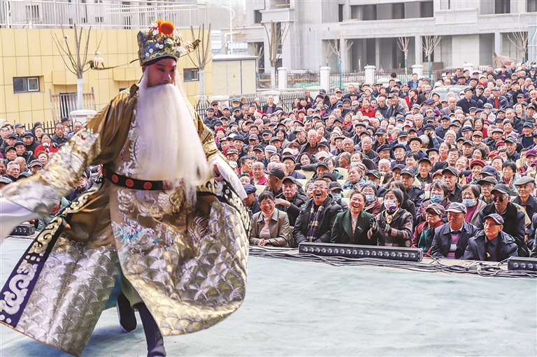 3月16日,孝义市留义村崇文学府,人们在观赏晋剧《徐策跑城》。 图 / 孙燕