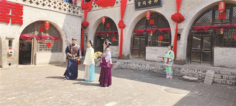 全市乡村旅游重点村建设工作启动以来,各县(市、区)深入学习践行“千万工程”经验,认真贯彻落实市委、市政府决策部署,结合实际,深入挖掘本地红色文化、自然风光、人文景观等资源优势,加大投资力度,以项目建设为抓手,全力推进乡村旅游重点村建设。图为柳林县陈家湾乡高家垣村结合传统民居创作的沉浸式情景剧《高员外招婿》正在为游客表演。 刘少伟 摄