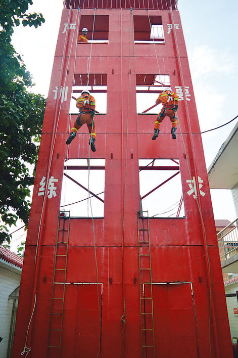 “原地攀登挂钩梯主要用于消防员在灭火救援以及抢险救援中对楼层内被困人员,利用挂钩梯快速爬至被困人员楼层位置进行施救。坐膝悬垂下降主要是消防员在高空救援中使用,利用绳索快速滑降至救援楼层窗口对被困人员进行施救。”在下一项技能汇报表演的准备过程中,身边的消防战士给记者解释刚结束的技能汇报表演。