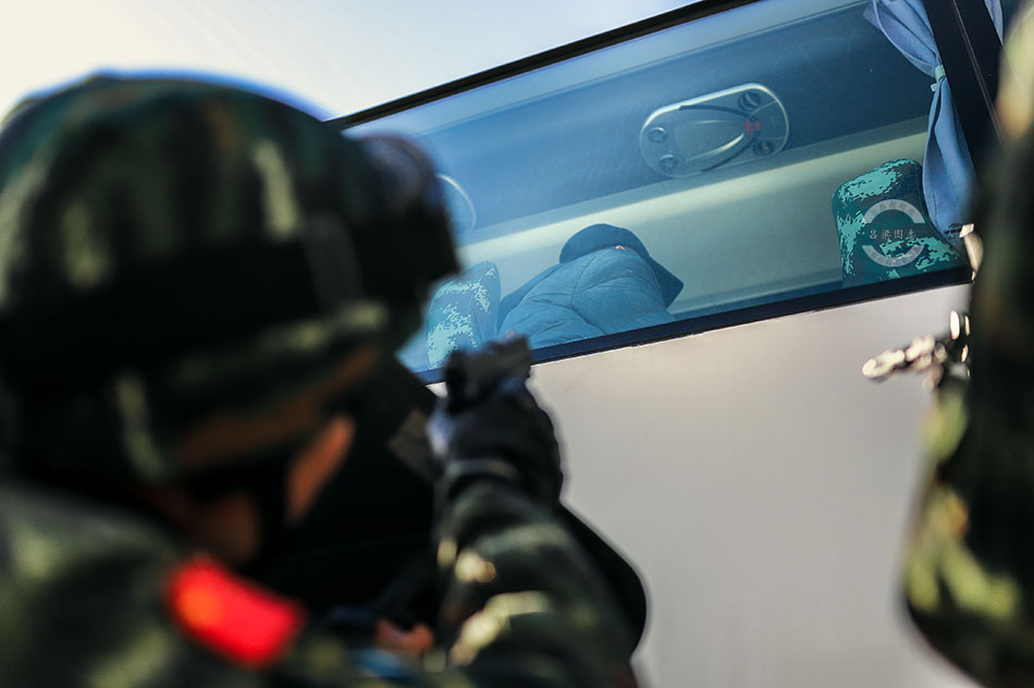 特战小组火力突入车内,和“恐怖分子”正面对峙。曹正玉 摄