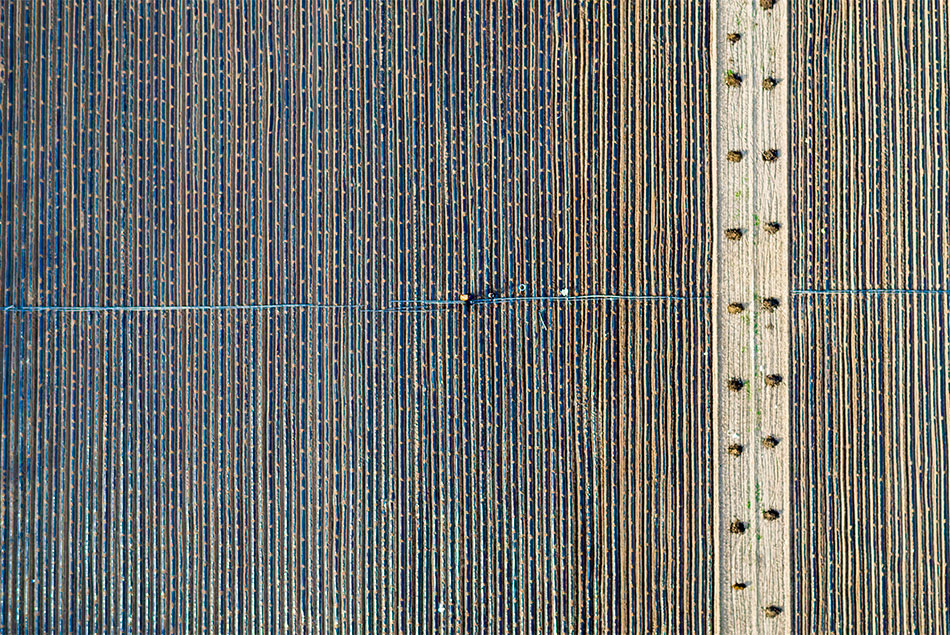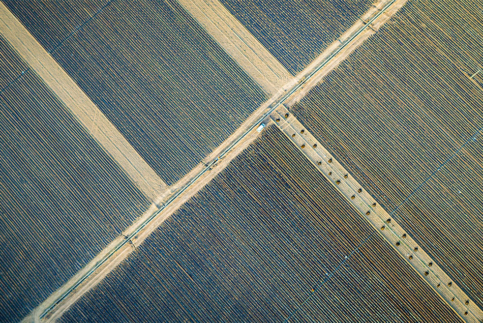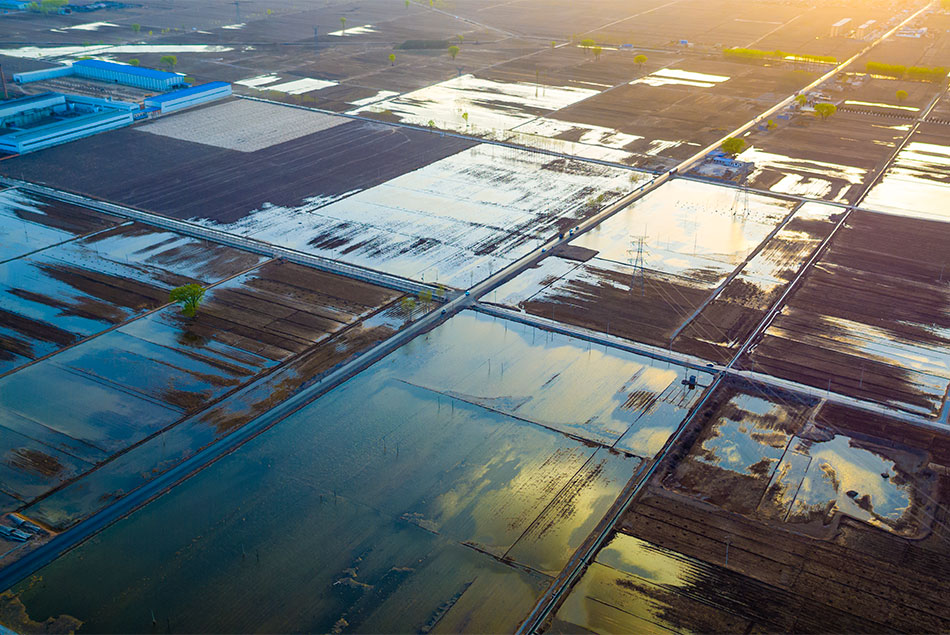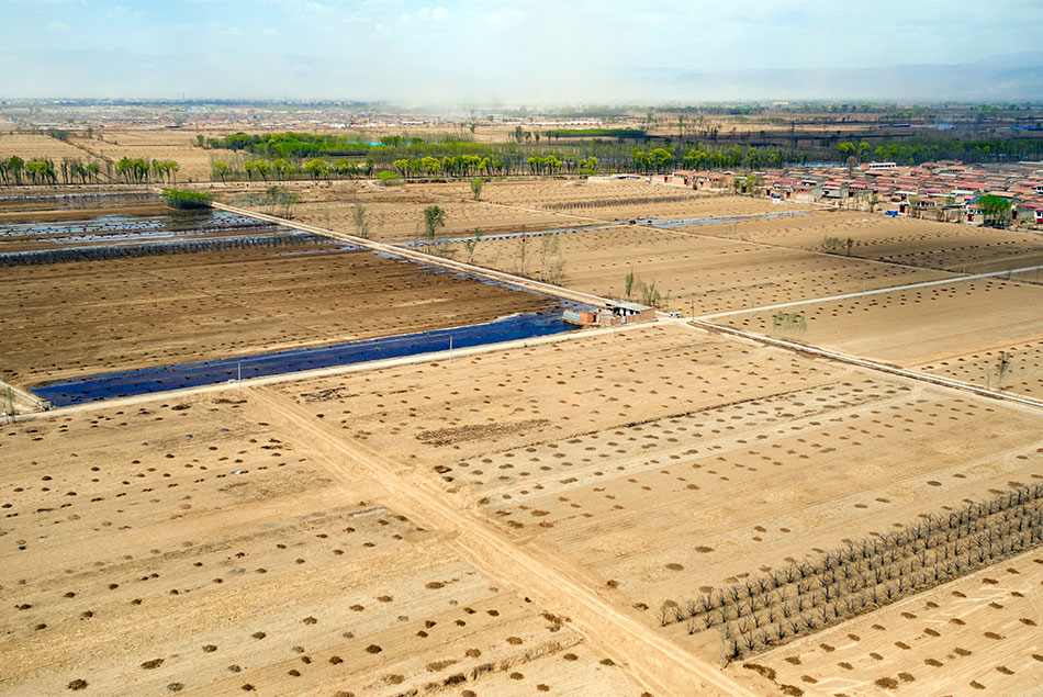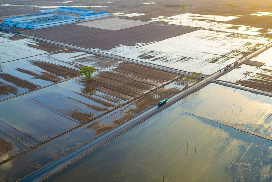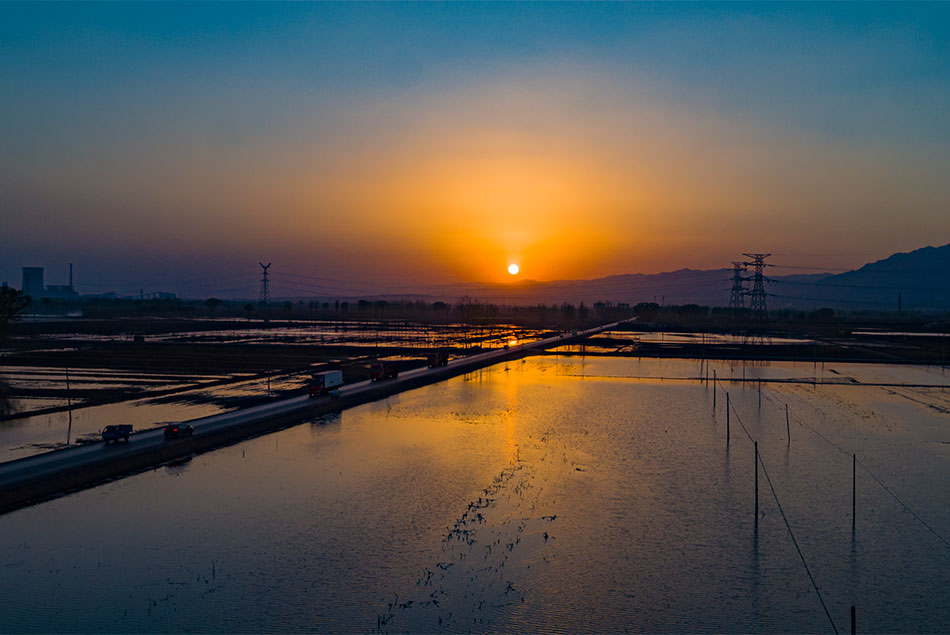 大面积的水浇地,在夕阳的映衬下宛如长河落日般的美景。