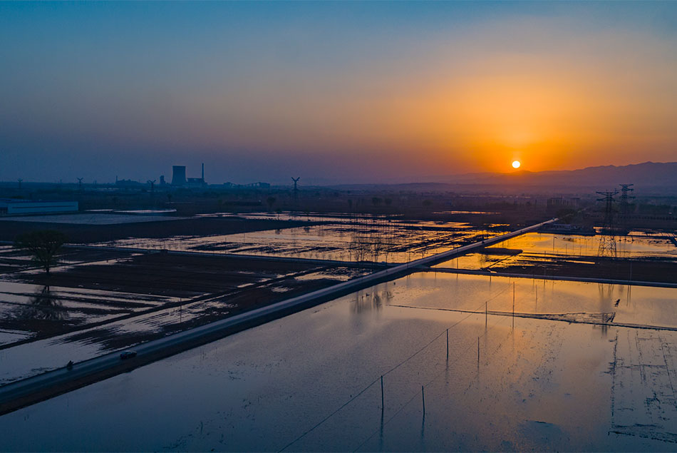 在落日的映衬下,文水县北张乡上河头村的水浇地宛若江南水乡。记者 刘亮亮 摄影
