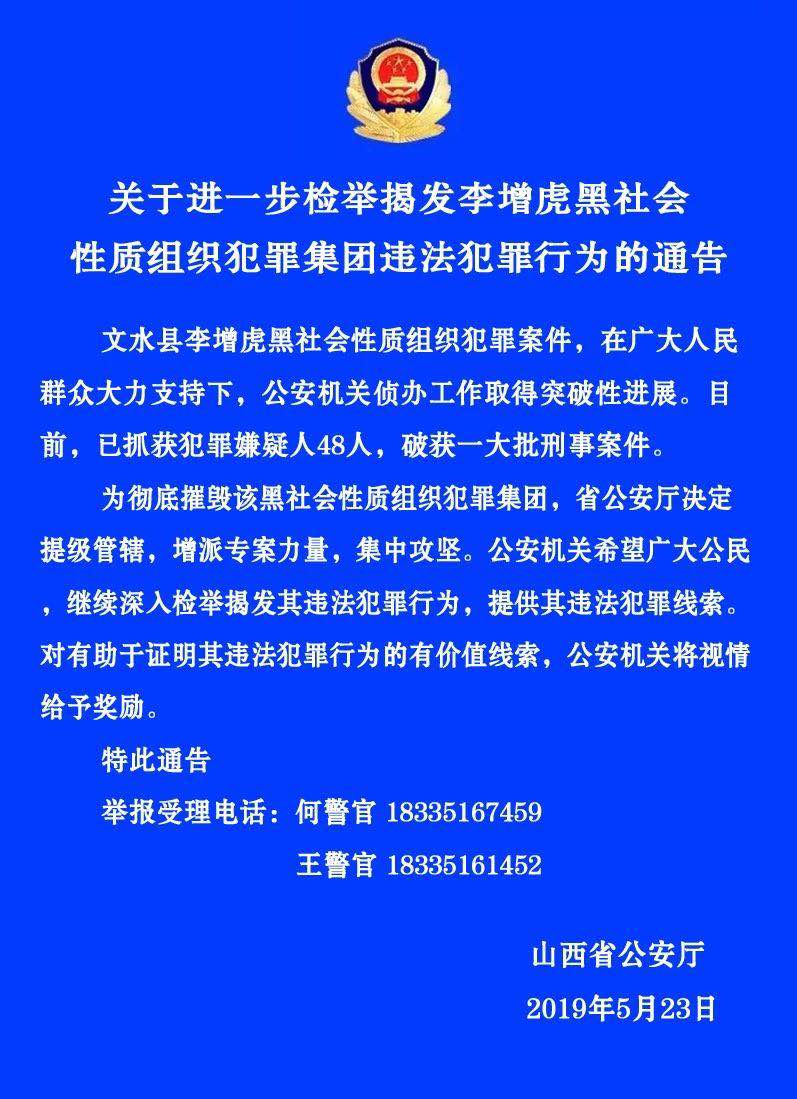 关于进一步检举揭发李增虎黑社会性质组织犯罪集团违法犯罪行为的通告