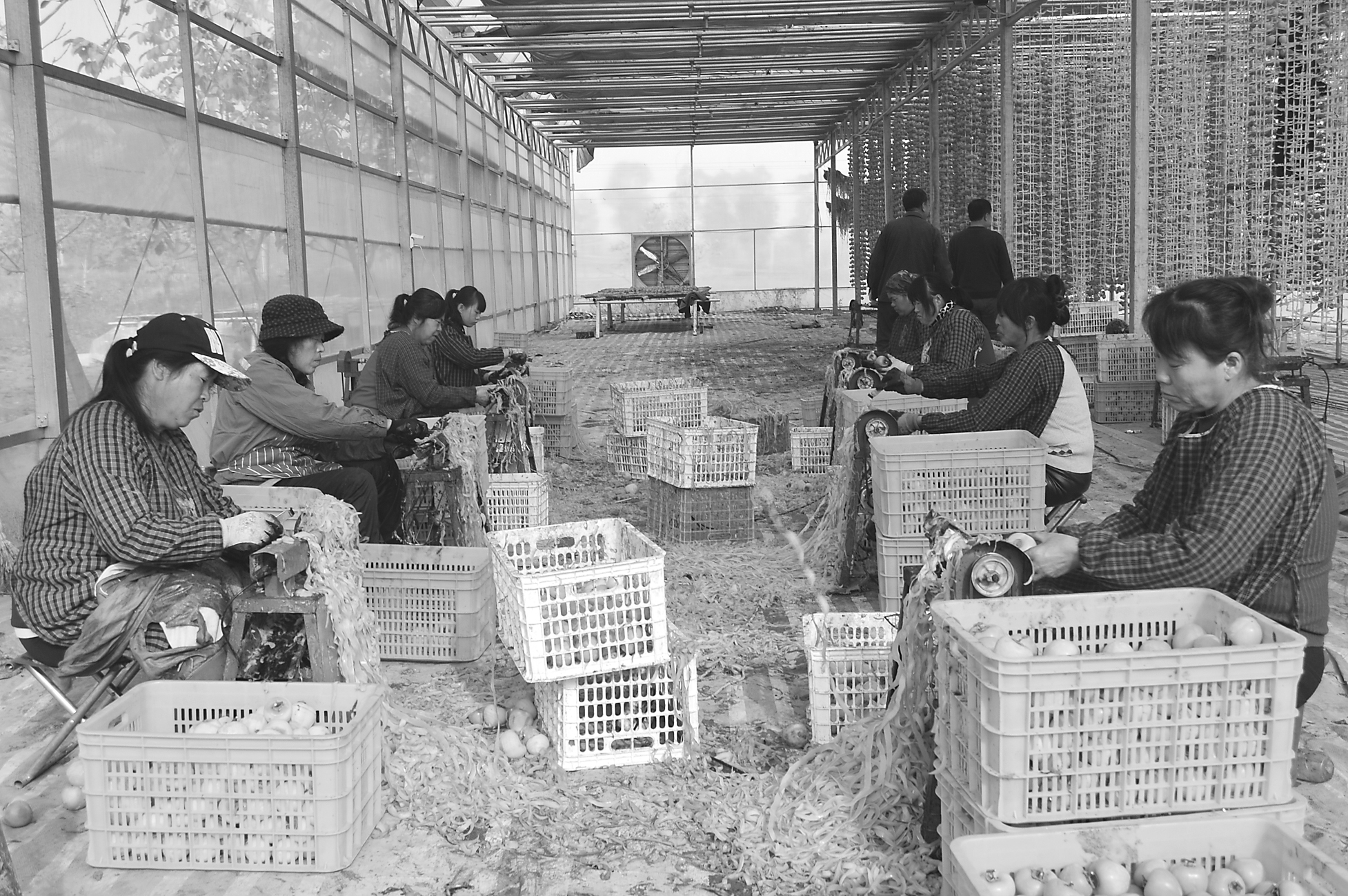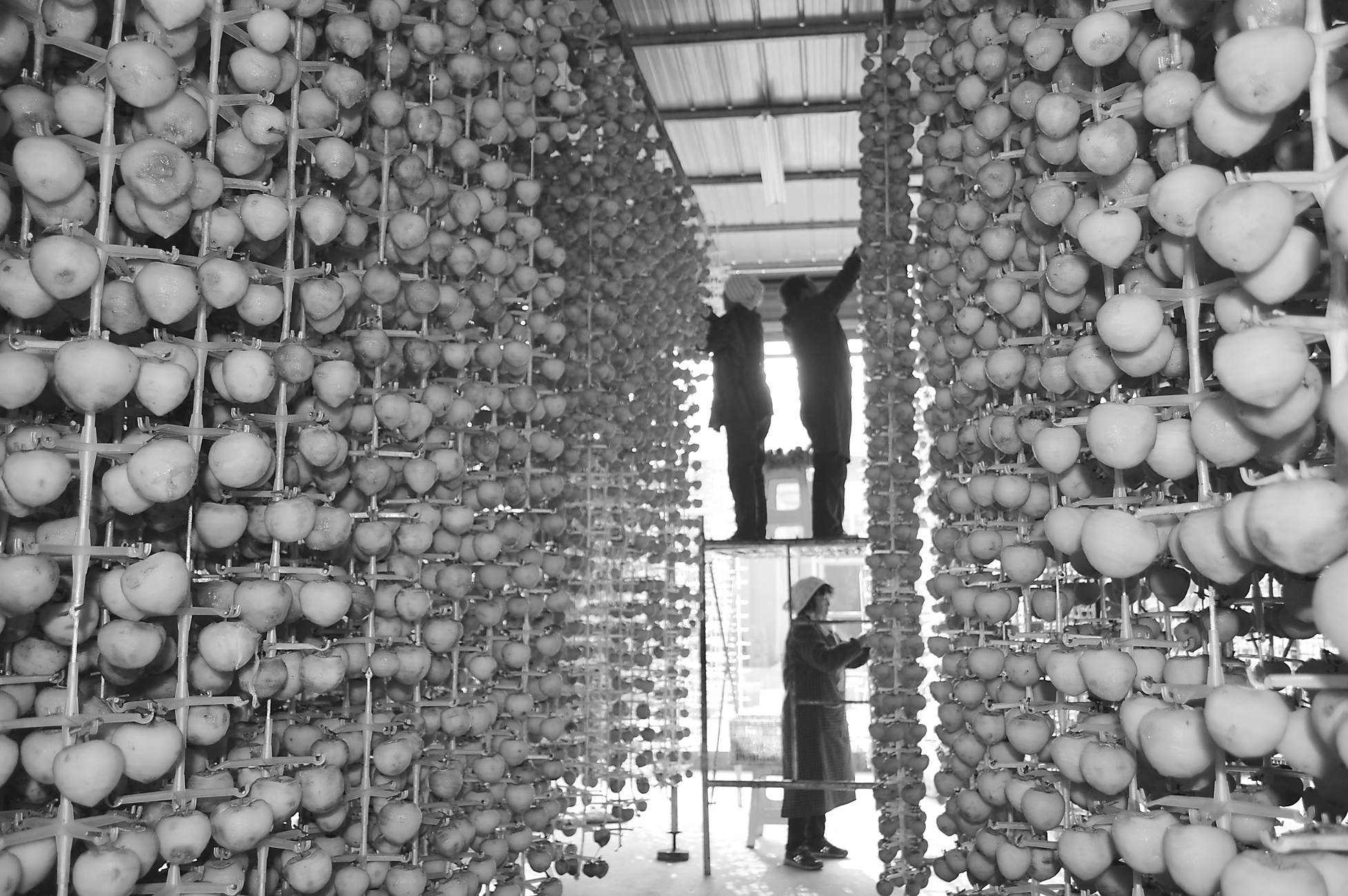孝义“牛心柿子”是国家地理标志产品,以独特的牛心形状、鲜甜糯实的口感、丰富的营养价值声名远播。在孝义市兑镇南垣6村“牛心柿子”主产区,柿饼加工也是一项传统支柱产业。霜降过后,一千余亩柿子红了,农民们忙着采摘柿子、加工柿饼,红红的柿子染红了深秋。当地柿农把收获的柿子有的自己经过手工刮皮、吊晒后加工成柿饼自销,有的采摘后卖给村里胜溪惠民柿子合作社,远销全国各地,成为深秋农民增收致富的特色产业。图为10月23日,胜溪惠民柿子合作社的员工正在削皮加工吊晒柿饼。 李竹华 摄