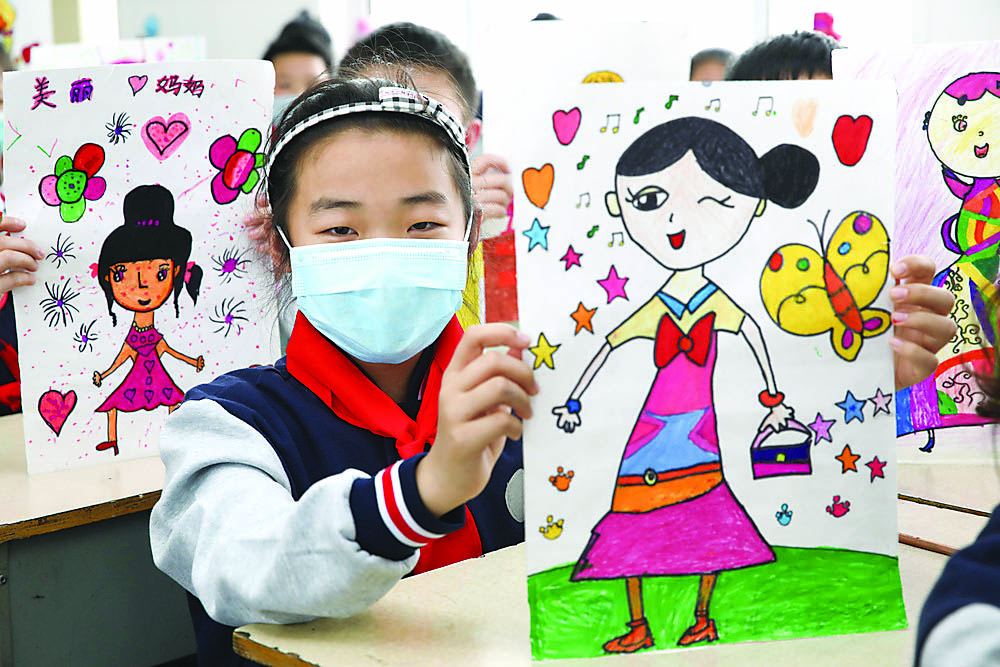 5月9日,江苏省连云港市赣榆区黄海路小学学生展示自己绘制的妈妈形象。