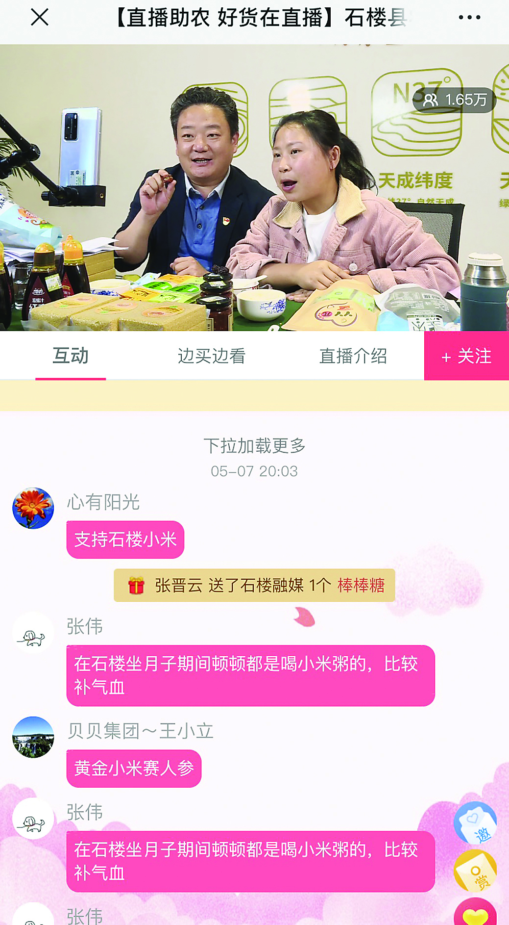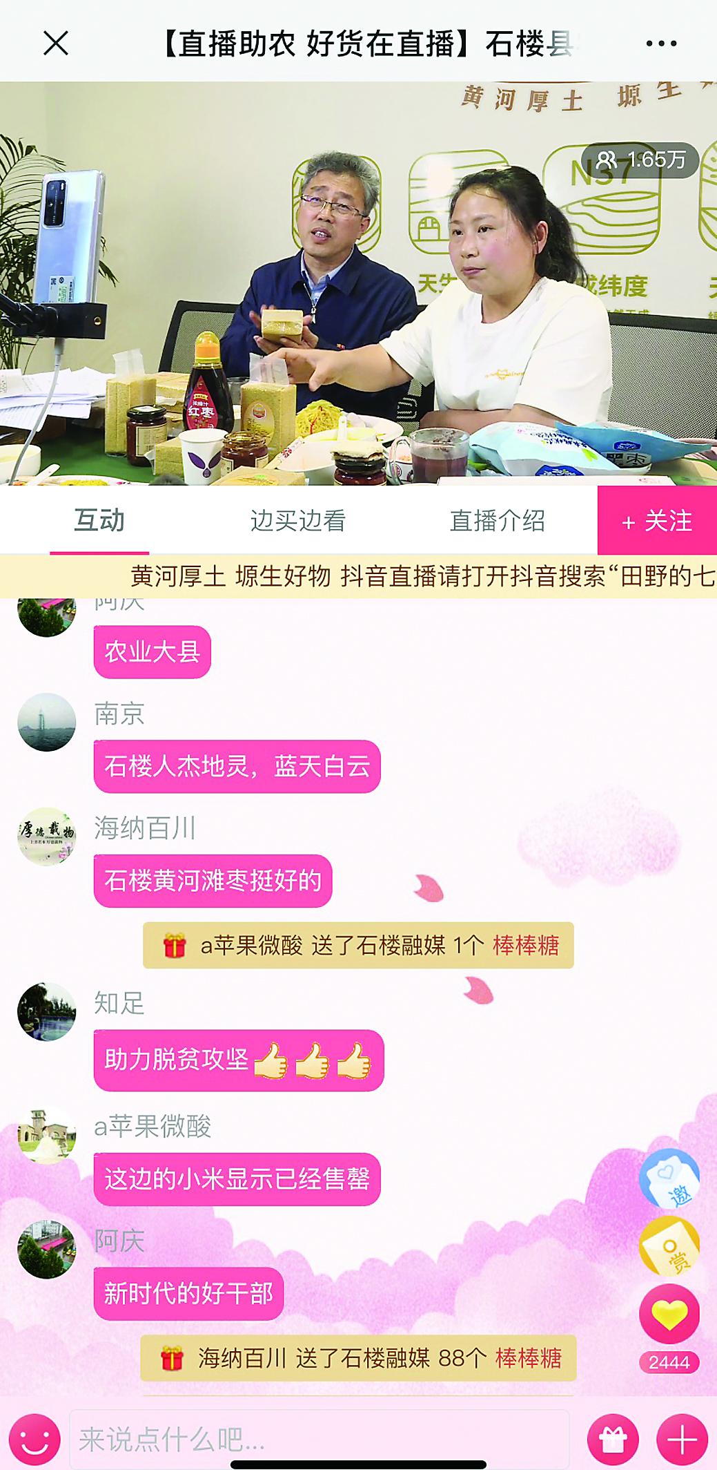 “大家好!我是石楼政府县长陈浩,我为‘塬谷石楼’品牌代言,石楼地处神奇的北纬37°,这里四季分明,光照充足,而且没有工业污染,大自然的灵气赋予石楼塬生优品,我们的有机农产品富含多种微量元素,是您健康生活的首选…… ”5月7日晚,石楼县委副书记、政府县长陈浩,县委副书记、团中央驻石楼扶贫工作队队长孟利走进抖音助农达人“田野里的七月”的直播间,与主播同框,妙语连珠,侃侃而谈,从石楼独特的地理特征、淳朴的风土人情到塬生好物绿色有机农产品以及丰富的红色旅游资源,通过产品介绍、现场试吃等形式,全方位、立体化地向广大网友推介了石楼小杂粮、红枣、蜂蜜、核桃等多种农产品,吸引众多粉丝关注、点赞、下单。据了解,当晚成交量达38万元。