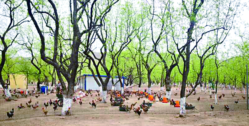 驱车前行的路上,听着当地的人文历史,翻过钟鼓山,来到前曲峪村。穿过一条宁静幽然的巷子,顿觉一片豁然开朗。郁郁葱葱的枣林里热闹异常,鸡叫声、鸟叫声、鹅叫声还有牛儿的铃铛声不断从林中传出,只见鸡群在林下觅食,见人走来,便四处乱窜,抬头一看,还有些鸡站在枣树枝上悠闲地抓虫子……令人惬意的田园风光和村民们饱满的笑容共同描绘了一幅美丽乡村新画卷。