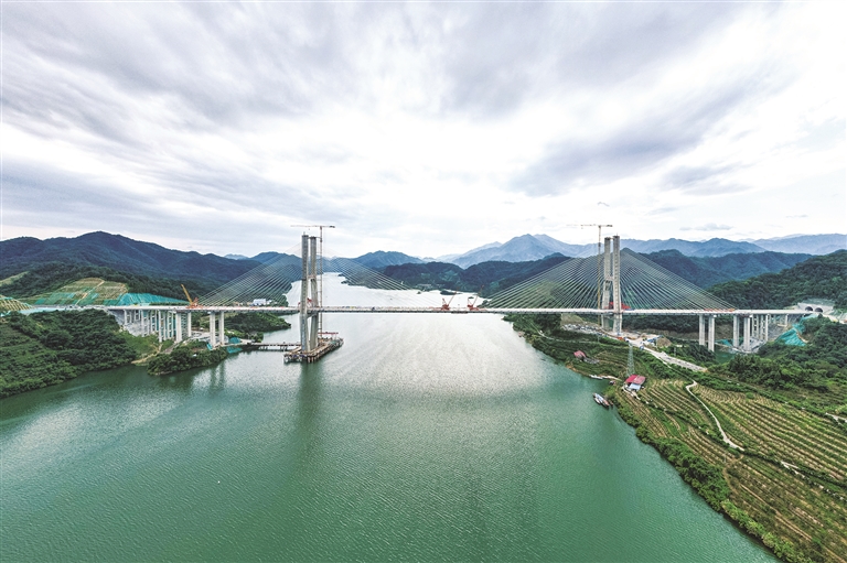 这是7月7日在湖南省益阳市安化县拍摄的官新高速雪峰湖大桥施工现场。