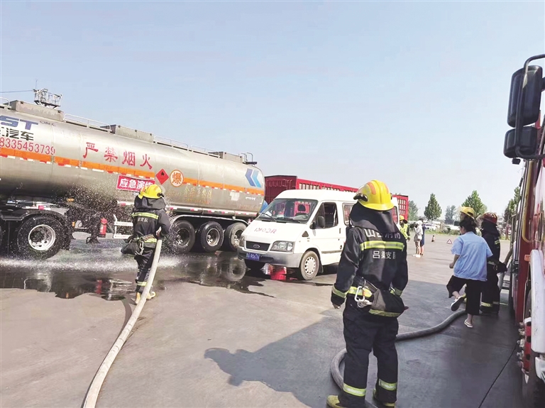 “喂,110 吗?文水园区大道金地路口发生一起交通事故,一辆货车追尾碰撞一辆运输乙醇的危化品车辆,危化品车上罐体变形有泄漏危险,货车驾驶人被困在驾驶室内,请求救援,请求救援……”这不是真实的交通事故来袭,而是7月18日文水县组织23户危货运输企业及县交通运输局、交警大队、消防大队、急救中心进行交通运输安全事故应急救援演练现场。