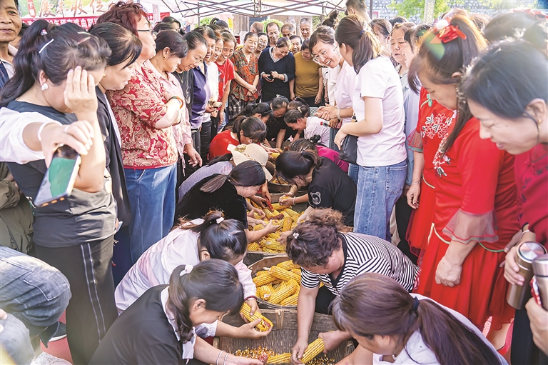 夹豆子、剥玉米、背靠背夹气球等游戏,贴近农村生活,是村民生产劳动的场景再现,具有浓郁的乡村特色。虽然规则简单,但趣味性十足,场上选手认真努力,场下群众人声鼎沸。