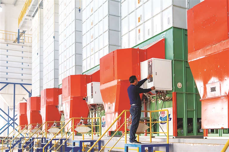 10月15日,在南县南洲桥国家粮食储备中心,工作人员在操作烘粮设备。