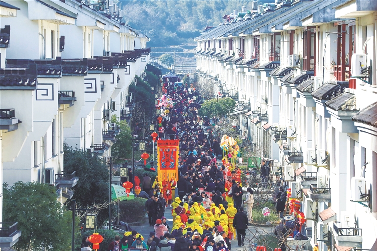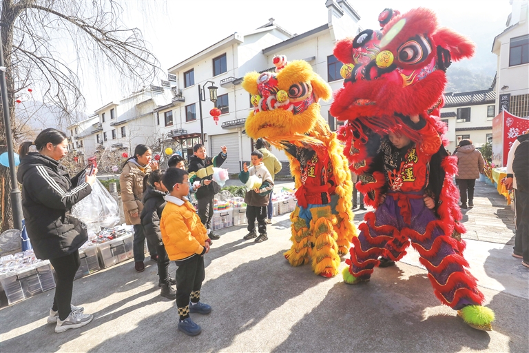 1月28日,浙江省建德市莲花镇开启“莲花游礼·戴家过年”第五届年俗文化节暨戴家过大年系列活动。在现场举行的“越吃越有味儿”乡村百家宴上,100桌家宴在莲花镇戴家新村民宿一条街上蜿蜒展开,村民们用精心准备的特色美食款待远道而来的客人。游客在品美食的同时欣赏传统舞龙舞狮、莲花清洁灯、跳竹马等非遗文化表演,感受建德山乡原汁原味的年俗文化。 新华社记者 徐昱 摄