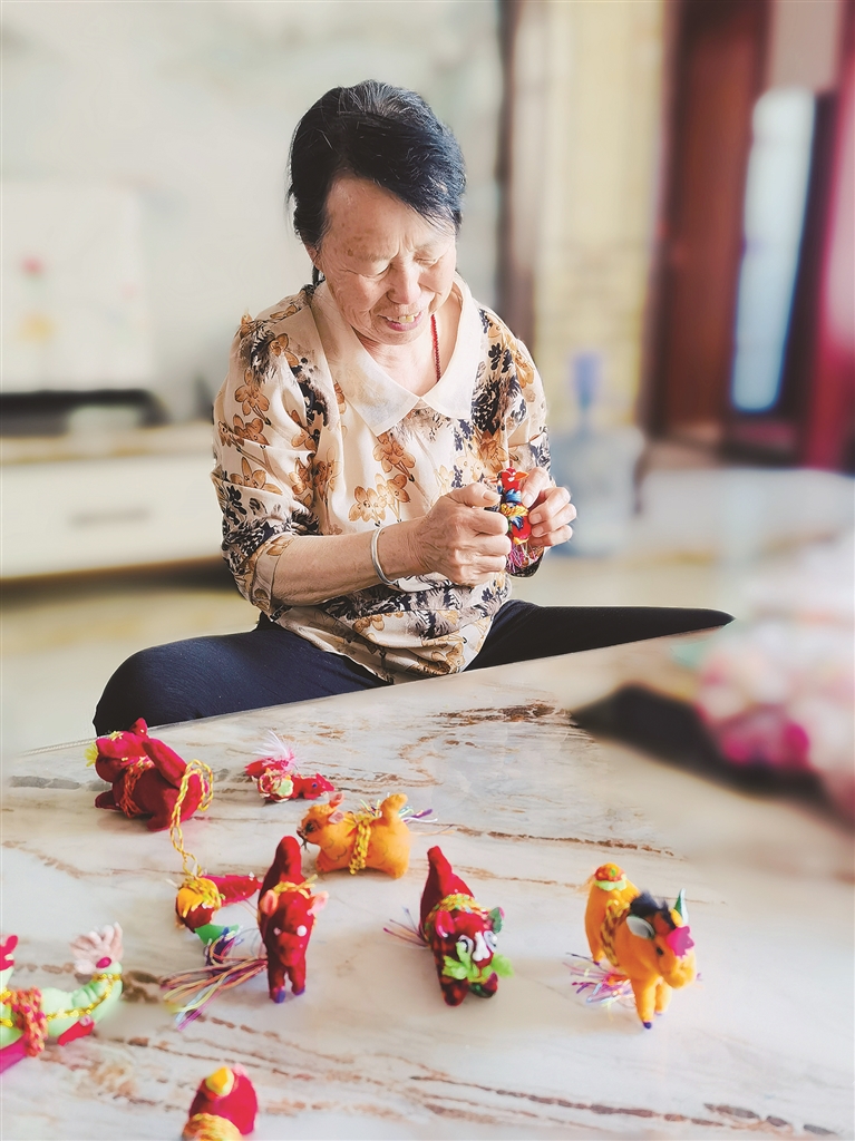 “这个活儿细致繁琐,每年都要提前做,去年做得少,好多人们没买上,今年喊叫着让我早点动手。”张改兰笑着说。距今年端午节还有一个月的时候,她就开始缝制荷包了。她指着刚做好的“宝贝”,脸上洋溢着满意的笑容,一边整理装盒,一边介绍道:“这是十二生肖荷包里面的马,你看这个马尾巴必须蓬松,马鬃要整整齐齐的才像样。”一个个色彩鲜艳、造型独特的十二生肖荷包呈现在眼前,让人爱不释手,心生赞叹。