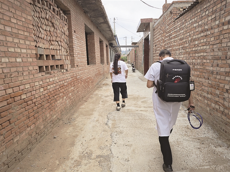 马坊镇马坊村村医秦武贵背着全科医生助诊包上门为群众瞧病。 冯海砚 摄