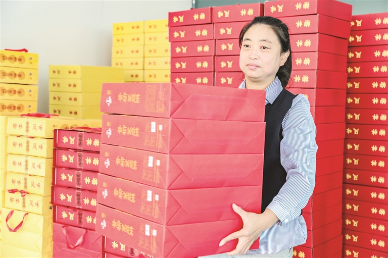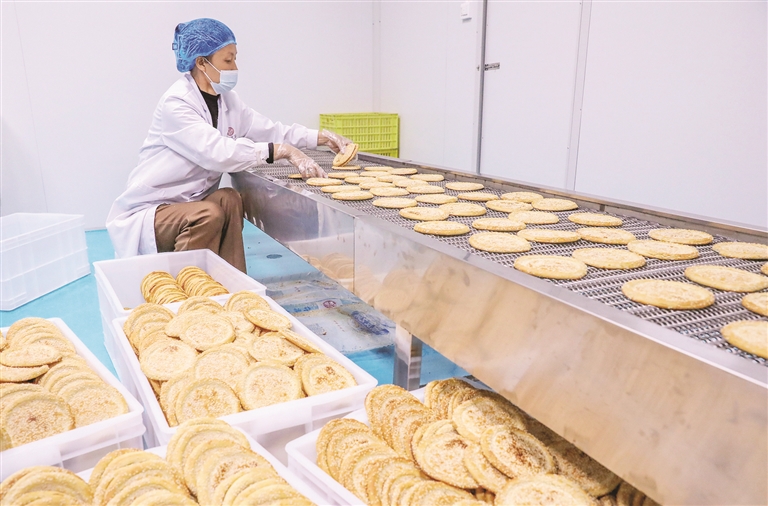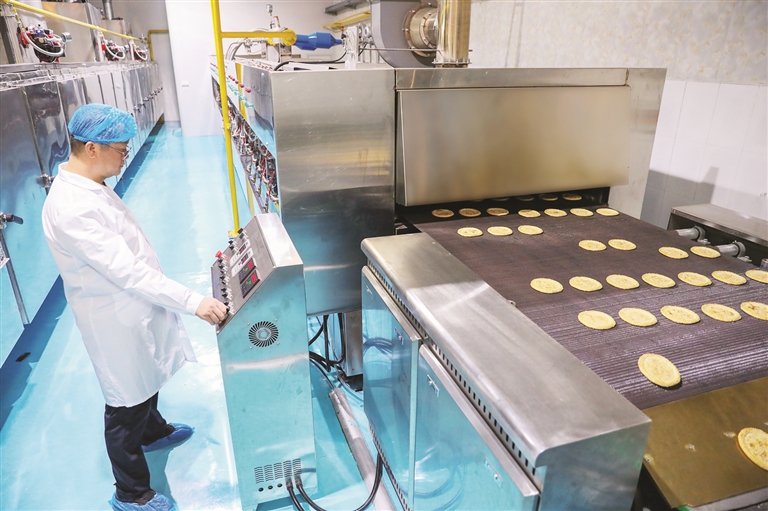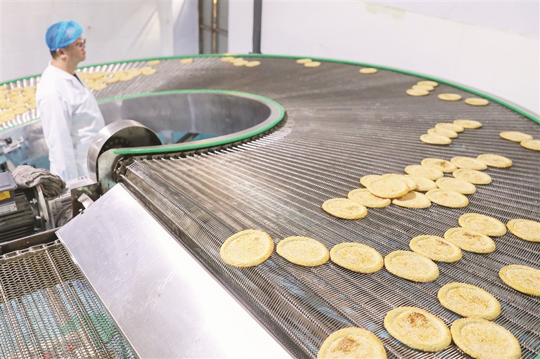 柳林芝麻饼历史悠久、誉满秦晋。近年来,晋柳农产品供应链管理有限公司为将这一地方特产做优做强,特聘请专家成立研发团队,历时两年,投资500余万元,将传统芝麻饼制作工艺搬上了流水生产线,并研发出红枣、茴香等多种口味,酥脆筋道的口感进一步升华,受到消费者的一致好评。图为该公司生产车间。 崔彦平 摄