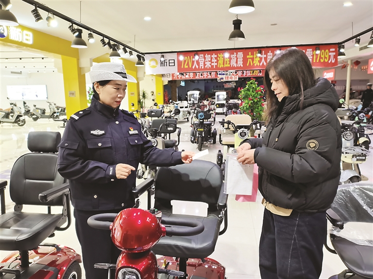 为进一步加强电动车源头管理,把牢源头风险治理“关口”,有效遏制和杜绝电动车道路交通违法行为,确保人民群众出行安全,近日,交城交警联合市场监督管理部门走进辖区电动车销售点开展专项检查及宣传活动,重点检查了所出售电动车质量、合格证及主要技术参数,在售电动车是否已获得国家认证,是否有机动车整车出厂合格证和车辆一致性说明书,是否存在销售非标准产品,是否存在违规销售、拼装改装等不良行为。并通过面对面发放宣传资料等形式,讲解电动车无牌无证、超标电动车上路行驶的危害,并提醒购车群众,购买电动车之后,要及时到车管所办理登记上牌业务,同时要求电动车驾乘人员要规范佩戴好安全头盔,禁止非法加装遮阳伞篷、超员上路行驶。
