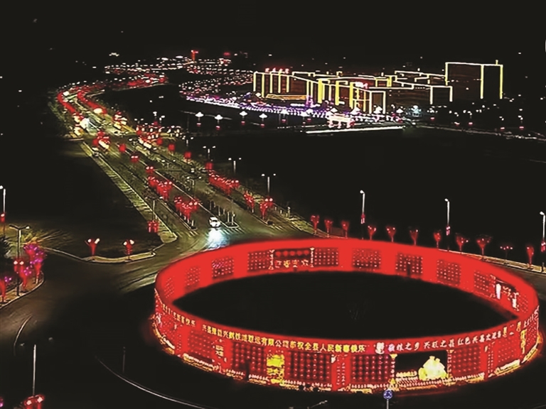 城区中心南沟门前的大桥上,1000盏红灯笼将“中共兴县县委、兴县人民政府向全县人民拜年”的牌楼,装扮得热烈喜庆、暖意融融。县政府大门前的人行漫道上,运用新型光电技术做出的五个新式彩灯惊艳亮相,通过光影变幻不断旋转,在地面上投射出鸳鸯戏水、年年有余等吉祥图案,新颖的手法、生动的景象,让人无不啧啧称奇。