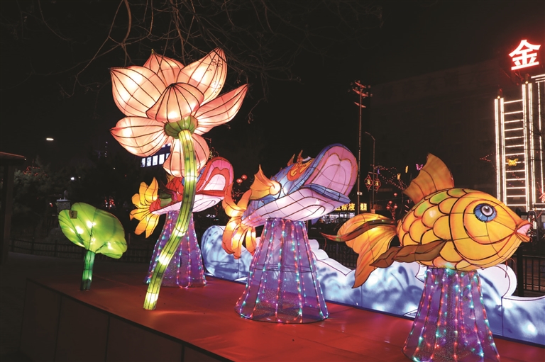 白天,各种主题花灯在阳光的照耀下鲜艳夺目,红灯笼与蓝天白云相互映衬,构成了一幅美丽的画卷;夜晚,各式彩灯亮起,暖黄色的灯光透过红色的灯罩,洒在街道上,给寒冷的冬夜增添了几分暖意。