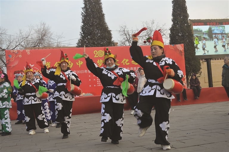 图为孝义市三皇庙景区内,民间艺人正在表演非遗汾孝秧歌。 李竹华 摄