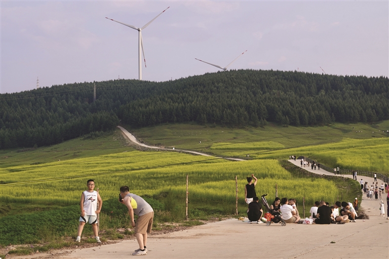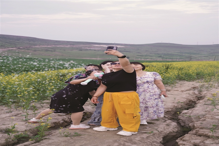 图为游人在西华镇打卡拍照,欣赏夏日美景。