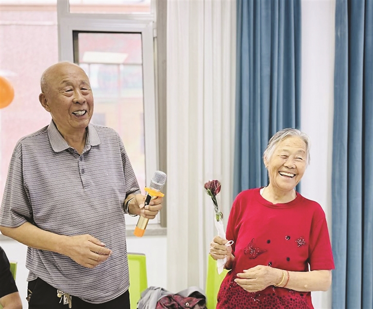 紧接着的“默契大考验”环节彻底点燃了现场气氛。桌上摆着写满日常场景的卡片,老人们需通过肢体动作让伴侣猜出内容。“心愿小签”环节最是戳中人心。志愿者把写着小任务的竹签放进竹篮,老人们轮流抽取。张叔叔抽到“讲讲当年最难忘的相处小事”,他清了清嗓子,讲起了坐绿皮火车去外地看老伴的故事。“当时我攒了两个月工资,坐了八个小时火车,就为了陪她过个周末,现在想起来,还觉得那会儿的火车声特别好听。”说着说着,眼里满是回忆的柔光。最后的“挚爱定格”环节,大家先跟着志愿者学做纸玫瑰花。不一会儿,每个人手里都有了一朵娇艳的“玫瑰”。随后,社区工作人员为结婚满30年、40年、50年的夫妻颁发“相守之星”奖状。
