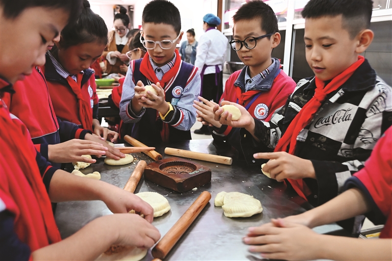 “你做了几个月饼呀!”校长解润芝笑着和学生们打招呼,眼里满是欣慰。一走进学校食堂,喧闹的欢笑声瞬间扑面而来,学生们围在操作台前,揉面团、压模具,热火朝天地忙着制作手工月饼,一张张小脸上满是藏不住的喜悦。