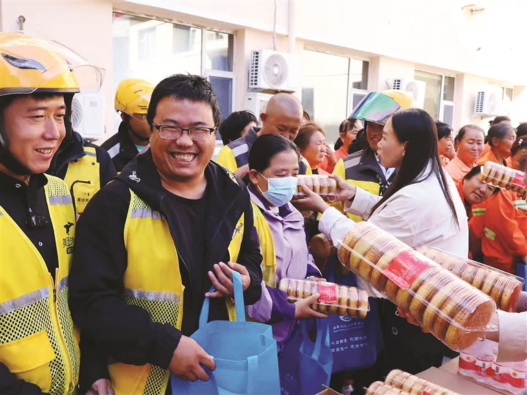 本报讯 (文/图 记者 木二东 通讯员 郑东慧) 中秋佳节将至,石楼县灵泉镇东风社区以“东风月圆送关爱,致敬城市服务者”为主题,在社区工会驿站开展了一场充满温情的双节慰问活动。活动聚焦环卫工人、外卖员、快递员、出租车司机等一线劳动者,通过送上定制中秋月饼礼盒与节日祝福,将社区的关怀与温暖传递给每一位城市“守护者”。