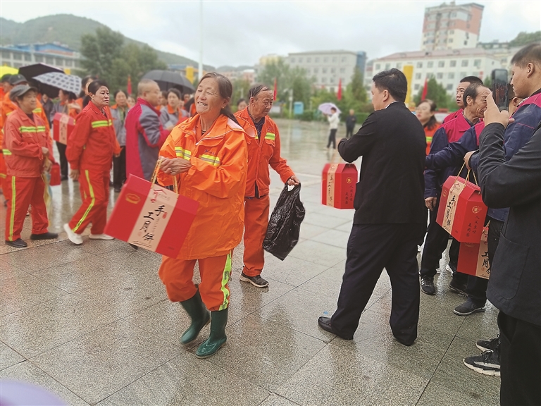 活动当天上午8时,细密的雨丝轻轻洒落,却丝毫未减县城月亮湾广场的暖意。一场简单却满含真挚的赠送仪式在此拉开帷幕。明明汽修厂厂长呼越明带领全体员工,将一盒盒提前备好的月饼递到旭易环卫公司370名环卫工人手中。这些月饼里装的不仅是香甜,更是对环卫工人起早贪黑、守护整洁的感谢。接过月饼的环卫工人们,脸上都漾着喜悦,这份温暖实实在在捧在手上,暖在心里。