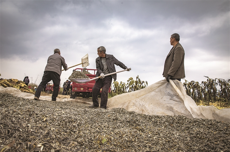 10月16日下午,天空中乌云翻墨、层层压境,山雨欲来的气息弥漫在空气中。在柳林县石西乡刘家垣村,农民全力收割已成熟的葵花盘,一派热火朝天的抢收景象。