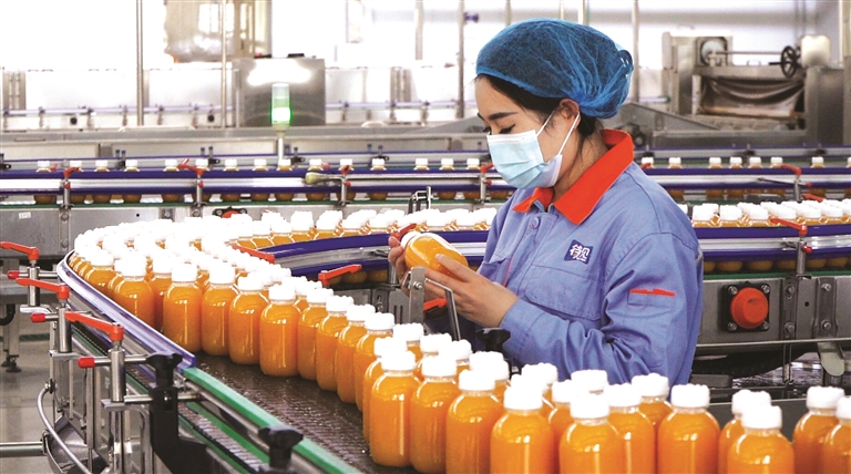 山西待见生物科技有限公司生产车间内,工人在生产线上检查沙棘饮品。