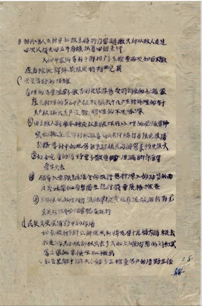 空舍清野的经验。埋的要深要分散,否则是很容易受到损失的;妇女儿童的清野要分散,要消灭脚印;领导上要强调法令的执行,进行深入的动员;要有组织的防止偷盗,经常检查地痞流氓的行动。