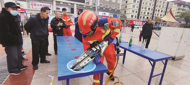 本报讯 (文/图 记者 刘少伟) 11月6日,离石区世纪广场上,一阵急促的“嘶嘶”声破空而来——直径不足0.3毫米的切割片精准削开生鸡蛋外壳,而那薄薄的内膜却完好无损。市消防救援支队队员马奖的这一绝活,瞬间把围观市民拉进消防宣传月“沉浸式课堂”。