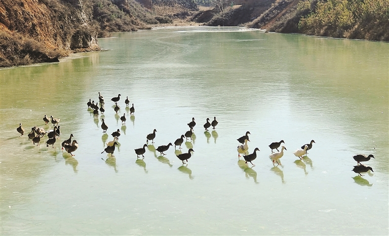 11月19日,在中国传统村落——方山县张家塔村,一群鸭子在结冰的水面上活动。今年以来,该村持续加大力度发展乡村旅游,“山谷水湖”景观的亮相,为古村落增添了新的韵味。
