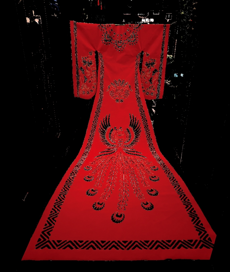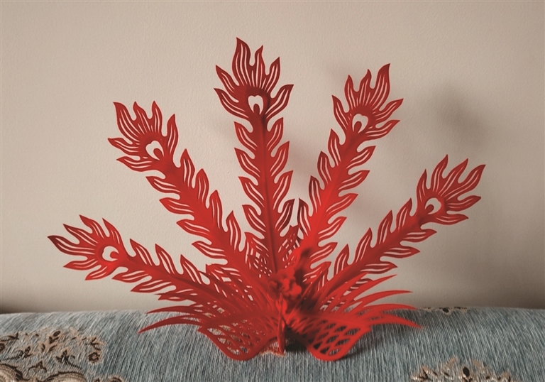 这份创新背后,是毫米间的极致匠心。凤凰头饰的翅膀与凤尾比例历经两次调整,只为呈现轻盈灵动的视觉效果;剪纸服饰既要保证全身图案主题统一,又要兼顾穿戴牢固度,在保留立体感的同时经得起日常触碰。“第一次看到平面剪纸‘立’在衣料上,随着动作轻轻晃动时,我觉得所有的繁琐都值了。”路冬梅回忆起模特首次试穿的场景,眼中满是欣慰。