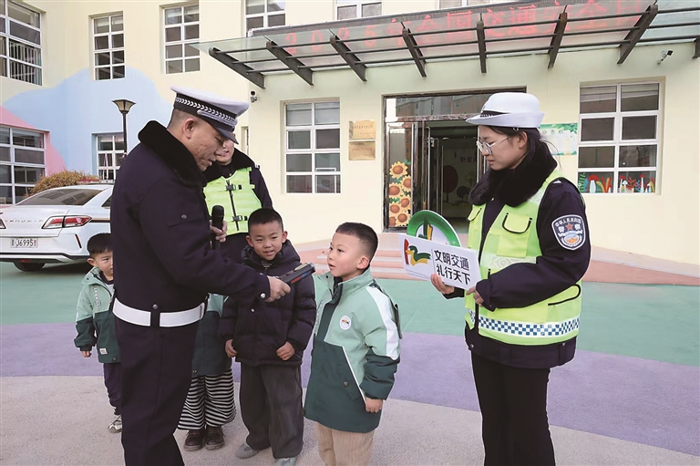 当日下午,交管大队民辅警走进龙山幼儿园,为孩子们带来了一场沉浸式交通安全宣传“盛宴”。活动分四个阶段有序开展:趣味开场环节,民警用生动形象的语言、趣味十足的提问,引导幼儿关注交通安全;警车科普与盲区体验环节,民警详细讲解警车功能及警灯、警笛的作用,通过现场演示和实景体验,让孩子们直观认识车辆盲区的危险,学会远离车辆危险区域;警用装备展示环节,民辅警将单警装备按“防护装备、执法装备、交通装备”分类摆放,逐一介绍装备用途;最后,民警通过交通安全儿歌回顾活动核心内容,开展趣味问答互动,为答对问题的幼儿发放精美礼品,并组织幼儿与警车、民警合影留念,活动在欢乐祥和的氛围中圆满结束。