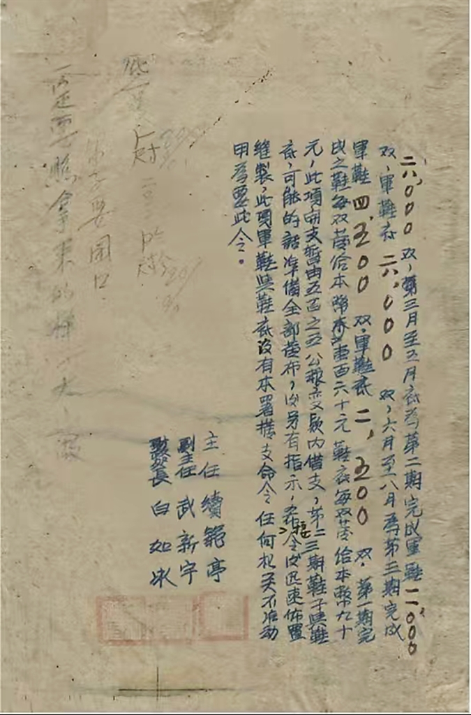为了保证军政民部队机关人员按时有鞋子穿,兹经本署决定该县在四四年度动员抗战勤务缝制军鞋二七五○○双(军队二三五○○双,政民四○○○双),军鞋底一四五○○双(军队一一五○○双,政民三○○○双)。鞋子要做的坚固耐用,鞋的底子与帮子针线缝的越密越好,严防鞋里夹藏谷糠烟麻毡片草等物,如发现有夹藏者,退回另做,仍然按期交鞋,鞋子尺码大小由军区后勤部规定,并且一定要依照规定尺码去做……这个任务要分三期完成,四三年十二月至四四年二月底为第一期,完成军鞋一二○○○双,军鞋底二八○○○双,三月至五月底为第二期,完成军鞋一一○○○双,军鞋底二八○○○双,六月至八月为第三期,完成军鞋四五○○双,军鞋底二五○○双。