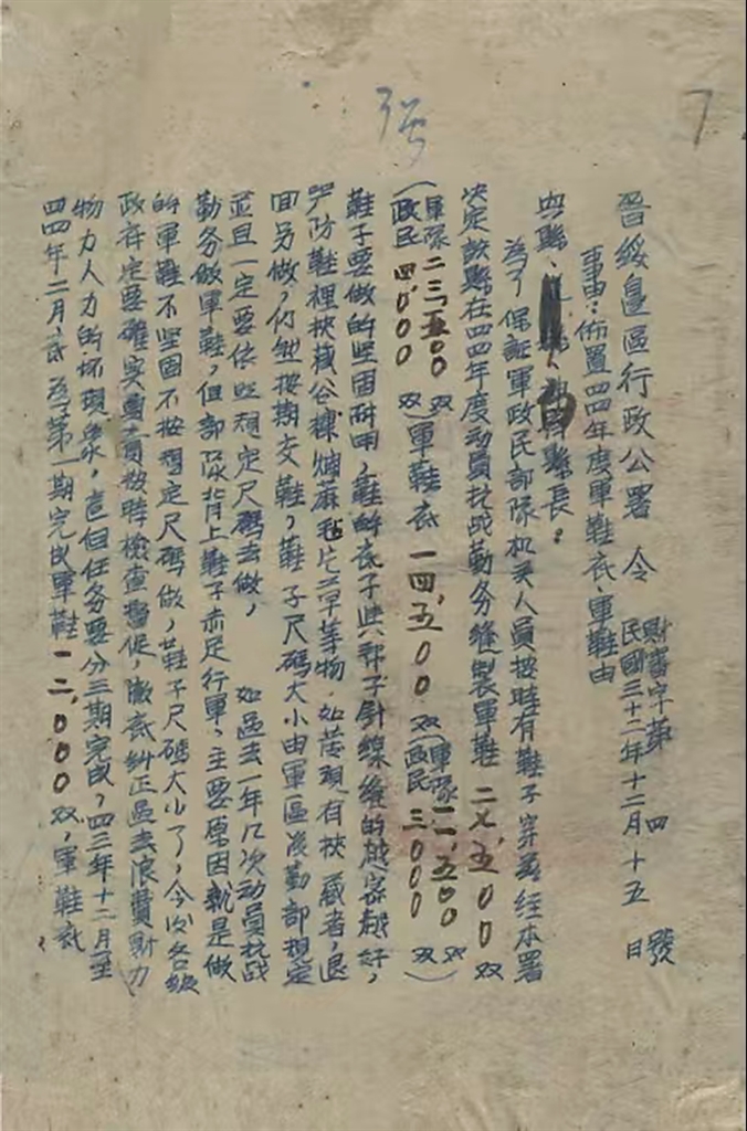 在兴县档案馆,一份档号为1-1-25的《晋绥边区行政公署关于布置一九四四年军鞋任务致兴县县长令》静静陈列。泛黄的纸张上,“一定要依照规定尺码去做”“帮子针线缝的越密越好”等字迹仍清晰可见,这些带着温度的文字,悄然将我们拉回那个妇女们用针线支援前线的抗战岁月。