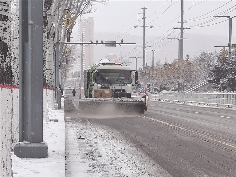 凛冽寒风裹挟着雪花扑面而来,路面很快被厚厚的积雪覆盖。从清晨到夜晚,市区各条街道上,身着橙色马甲的环卫工人身影随处可见,他们手持扫帚、推雪板等工具,有条不紊地开展清雪作业,不放过任何一处积雪区域。“下雪了,不管几点,先把路清通才放心!”今年48岁的崔永梅,已在环卫岗位上坚守了8个春秋。凌晨5点,当整座城市还在沉睡中时,她已准时抵达滨河南西路路段,开启了一天的清雪工作。“平时的清扫工作还相对轻松,可一到下雪天,清雪任务就变得格外繁重。这雪下得不停,必须抓紧时间清理,要是雪越积越厚,后续道路结冰,不管是人走还是车过,都容易打滑出意外。”崔永梅一边说着,一边熟练地挥动工具清理路面积雪。此时,她的手套、帽子早已被雪水浸透,睫毛上还沾着细碎的雪粒,但她忙碌的身影里满是干劲,脸颊也因持续劳作产生的热气泛着红润。